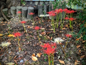 鳴子中央公園の東、鳴子町のバス停横の崖に咲く彼岸花