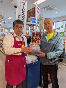 今度は、 鳴子で咲いた花から採った種として千倍以上になって福島に向かう ために里親の鳴子きずなのj会からマックスバリュ鳴子店長にお渡 ししました。