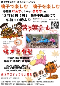 雨で中止になった鳴子きずなの会「秋イベント」を12月14日にリベンジ開催します。 一ケ月寝かしたさつまいもは甘みも増しているはずです。 12月恒例の落ち葉プールもあります。 みなさん来てくださいね。